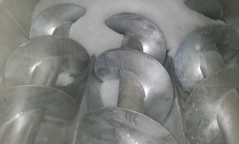 用途是預(yù)拌混凝土降溫(預(yù)拌混凝土是指由水泥、集料、水以及根據(jù)需要摻入的外加劑、礦物摻合料等組分按一定比例,在攪拌站經(jīng)計量、拌制后出售的并采用運輸車,在規(guī)定時間內(nèi)運至使用地點的混凝土拌合物)。片冰通過輸冰螺桿送入到自動稱重的裝置,與片冰一起加入的還有冷凍水,兩者一起輸送到攪拌器。