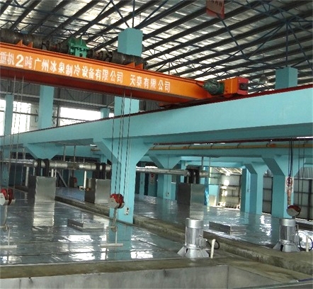 制冰池注滿鹽水,鹽水溫度被蒸發(fā)器冷卻。冰模內(nèi)加適量的水后放入制冰池內(nèi),利用低溫鹽水使桶內(nèi)水凍結成冰。出冰時,m個冰模固定成一排,共排列n排,使用鋼架固定,為了加快冰的凍結速度,用攪拌器使鹽水均勻的在冰模間循環(huán),待冰桶內(nèi)水凍結成冰后,用行車裝置將冰桶架吊送到融冰池,在池中浸2-3分鐘,使冰桶內(nèi)冰的表面融化,再把冰桶放在倒冰架上,冰塊就很容易脫離冰桶傾倒在帶有坡度的滑冰道上,使冰塊滑到送冰車中。然后把冰桶注水后放入鹽水池中繼續(xù)循環(huán)制冰。