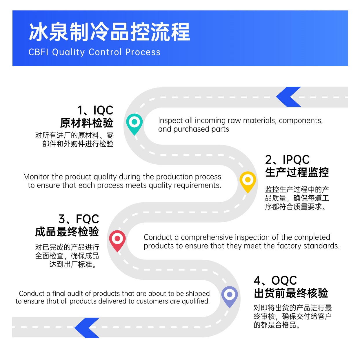 從原料甄選、生產(chǎn)制程、成品檢測到出廠驗收,CBFI 冰泉制冷以 20 余年行業(yè)經(jīng)驗積淀構(gòu)建了一套覆蓋全流程、全維度、全標(biāo)準(zhǔn)的質(zhì)量管控體系。我們遵循歐盟 CE/MD/PED 等國際標(biāo)準(zhǔn),采用大型光纖激光切割機(定位精度 0.05mm)、數(shù)控折彎機(折彎精度 0.5°)、CNC 加工中心等自動化設(shè)備,實現(xiàn)部件微米級精度加工;關(guān)鍵工序推行氬弧自動直縫焊、坡口焊接、熱處理消除內(nèi)應(yīng)力等精密工藝,確保焊縫飽滿牢固、長期使用不變形。