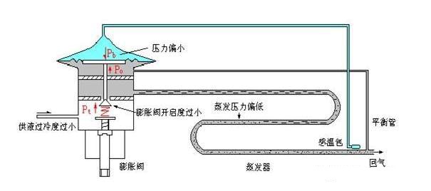 按照這一定律,如果膨脹閥出口壓力過低,相應(yīng)的蒸發(fā)壓力和溫度也過低。但由于進(jìn)入蒸發(fā)器流量的減少,壓力的降低,造成蒸發(fā)速度減慢,單位容積(時(shí)間)制冷量下降,制冷效率降低。