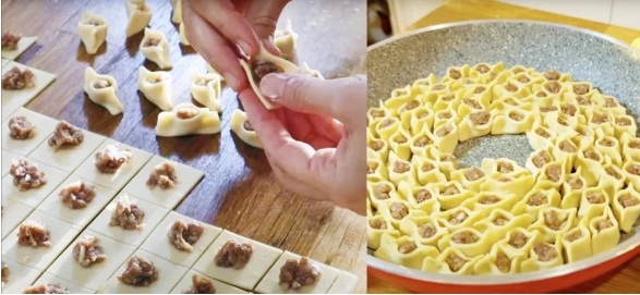 意大利餃子中最出名的數(shù) Ravioli 和Tortellini,翻譯過(guò)來(lái)大概就是水餃或云吞的意思。傳統(tǒng) Ravioli 肉餡里要放芝士,包成方形后用叉子的背面在四周按壓出條紋狀。Tortellini 個(gè)頭很小,也用肉餡摻芝士。