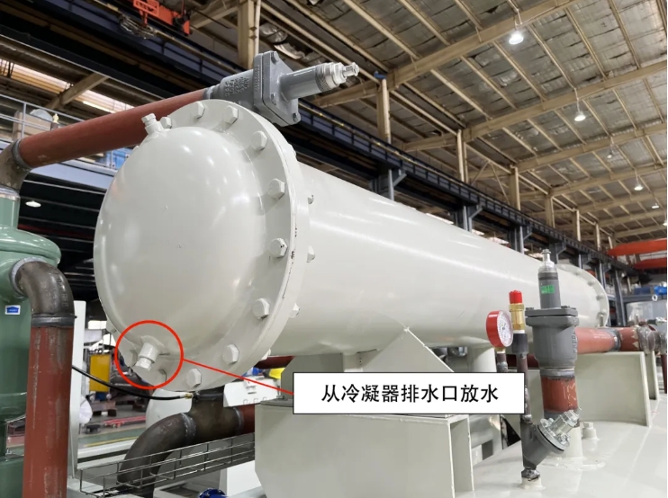 3、打開(kāi)冷凝器端蓋下面的排水匝閥,將冷凝器中的水排干。